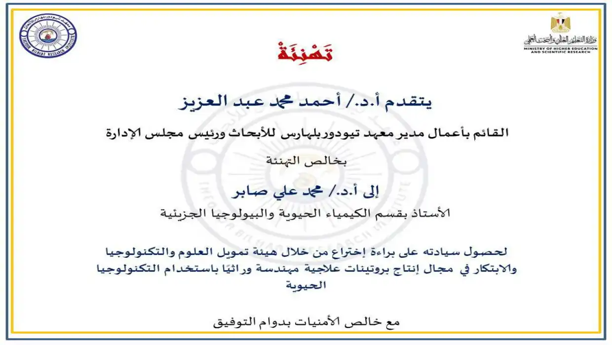 A new scientific achievement for Theodor Bilharz Institute: a patent for the production of therapeutic proteins using biotechnology.