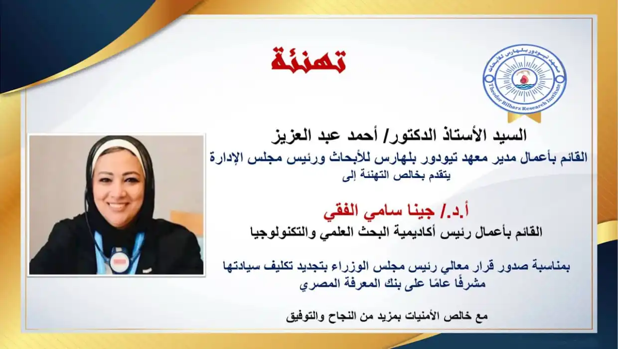 Professor Dr. Ahmed Abdel Aziz, Acting Director of Theodor Bilharz Research Institute and Chairman of the Board, extends his sincere congratulations to Professor Dr. Gina El-Feky, Acting President of the Academy of Scientific Research and Technology, on the occasion of the issuance of the decision by His Excellency the Prime Minister to renew her appointment as General Supervisor of the Egyptian Knowledge Bank.