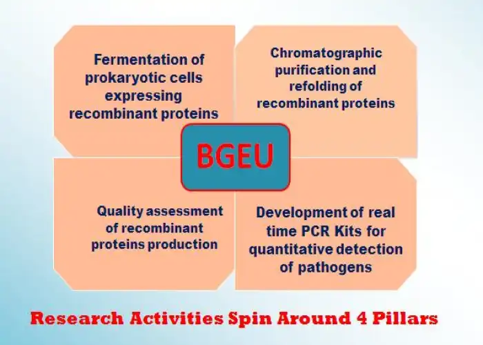 The Biotechnology and Genetic Engineering Unit (BGEU) was established for R&D and process development aimed at lab-scale and limited pilot-scale production of recombinant proteins of commercial importance, especially recombinant biopharmaceutical proteins. Five key recombinant therapeutic proteins—interferon alfa2b, interleukin 12, interferon gamma, growth hormone, and granulocyte colony-stimulating factor—have been successfully produced at the lab scale. R&D efforts have also led to progress in the limited pilot-scale production of some of these proteins. These achievements were made possible through numerous projects funded by the Academy of Science, STDF, and other funding agencies. The BGEU, in collaboration with the Center of Excellence in Recombinant Biopharmaceutical Proteins, aims to serve as an interface between scientific research and the biopharmaceutical and biotechnology industries. One of the unit’s main objectives is the development of molecular diagnostic assays for the detection of infectious and genetic diseases.