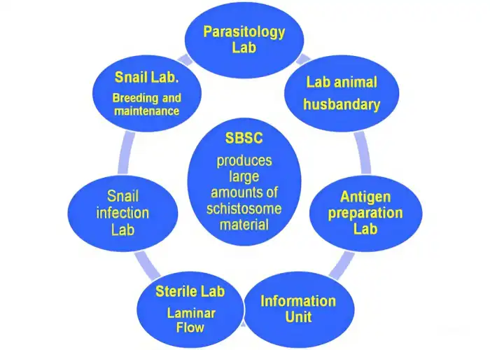 The Schistosome Biological Supply Centre (SBSC) was established in 1989 at Theodor Bilharz Research Institute (TBRI) through a research collaboration agreement between the institute and the University of Massachusetts Lowell, USA, funded by USAID. The center focuses on producing biological materials for scientific research, investigating compounds with potential molluscicidal and schistosomicidal activities, and providing high-quality research tools for schistosomiasis studies.