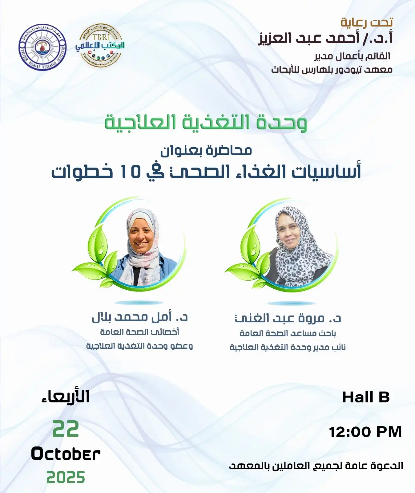 The lecture will be delivered by Dr. Marwa Abdelghany, Assistant Researcher in Public Health and Deputy Director of the Clinical Nutrition Unit,