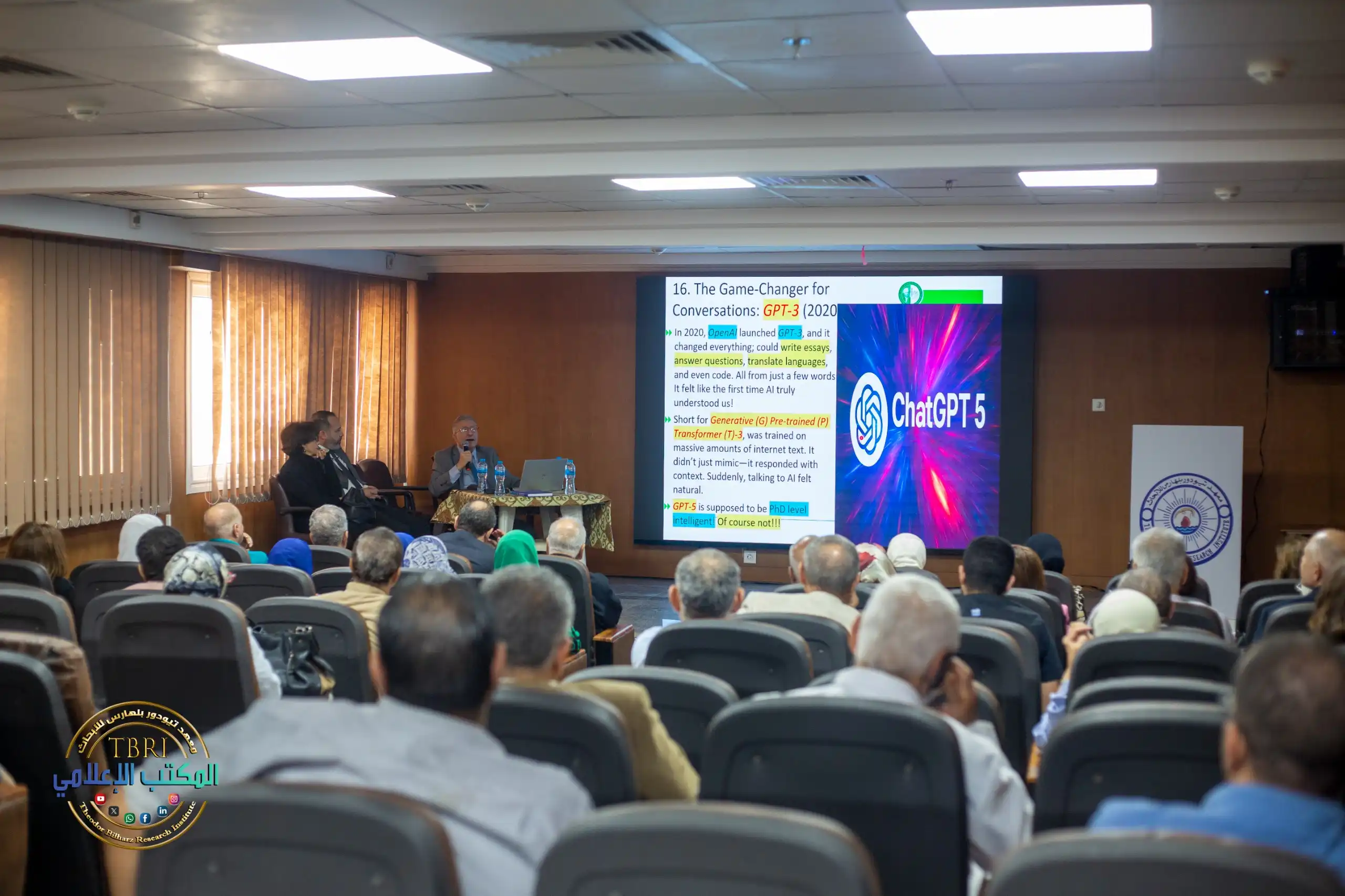 During the lecture, Dr. Ashraf Dahaba presented the evolution of artificial intelligence from its early beginnings, starting with the vision of AI’s founding father Alan Turing, and the coining of the term by John McCarthy in 1956. He traced its development through the creation of the first chatbot in 1964, followed by John Searle’s invention of real-time translation chatrooms in the 1980s, the launch of the robot Sophia in 2016, and finally the emergence of modern conversational models such as ChatGPT in 2020.