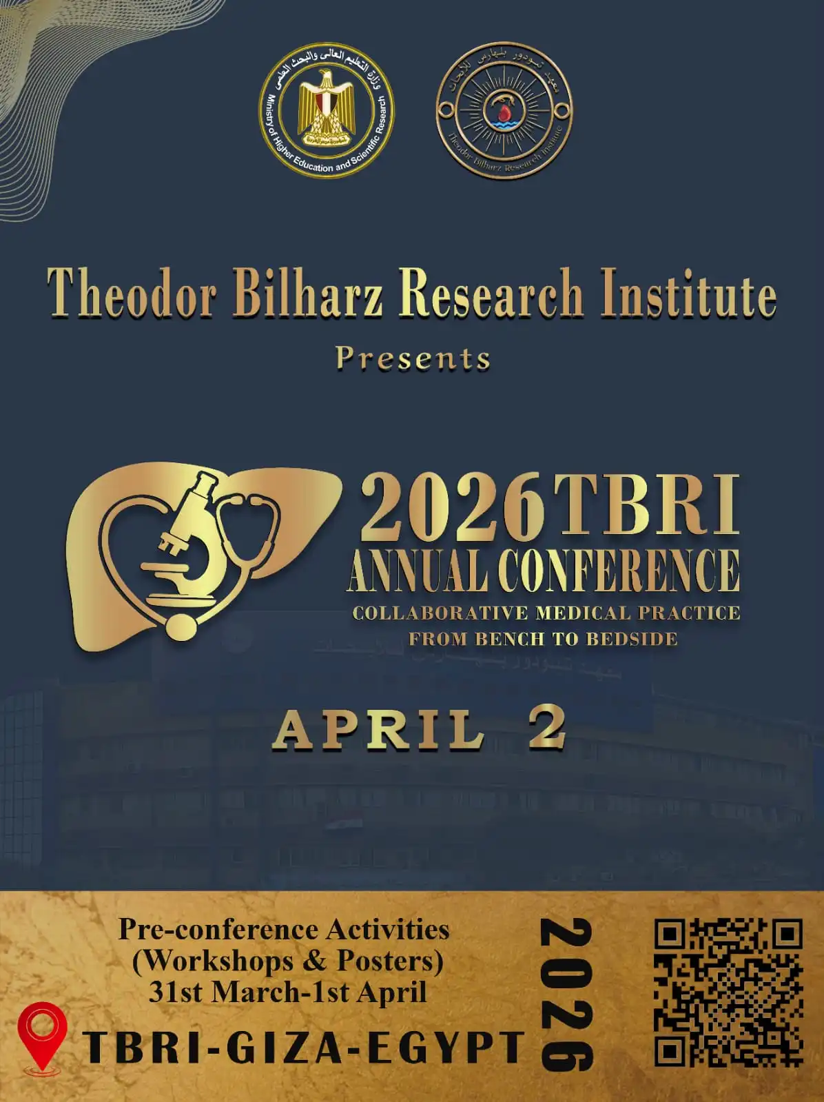 In line with the Institute’s commitment to supporting applied scientific research, promoting the concepts of multidisciplinary medical collaboration, and linking research outcomes with clinical practice to contribute to the development of the healthcare system and improve the quality of medical services, Theodor Bilharz Research Institute (TBRI) is honored to announce the convening of its Annual Conference 2026 under the auspices of Professor Dr. Ahmed Abdel Aziz, Director of the Institute and Chairman of the Board, titled: