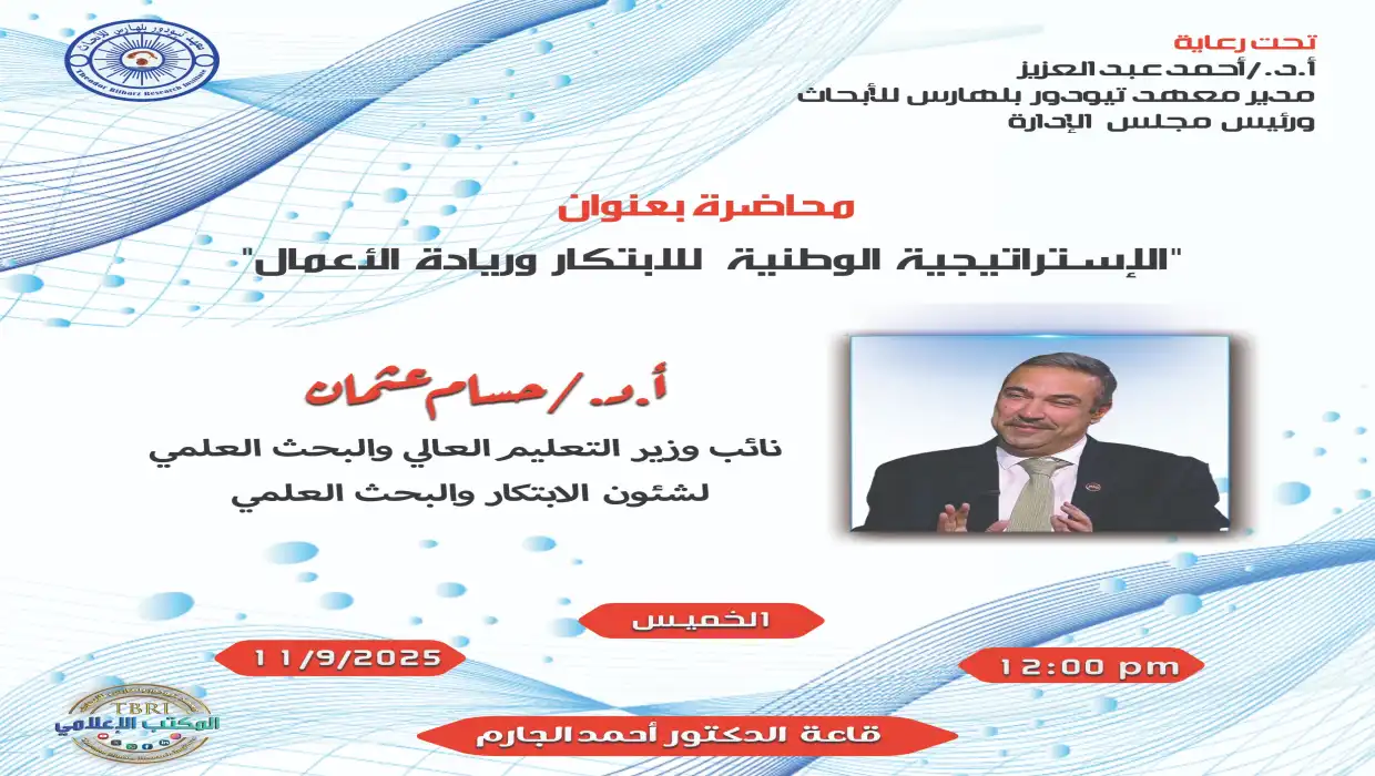 Theodor Bilharz Research Institute, under the chairmanship of Prof. Ahmed Abdel Aziz, is honored to welcome H.E. Prof. Hossam Othman, Deputy Minister of Higher Education and Scientific Research for Innovation and Scientific Research Affairs. His Excellency will deliver a lecture entitled “The National Strategy for Innovation and Entrepreneurship” on Thursday, September 11, at 12:00 PM, at Prof. Ahmed El-Garem Hall.