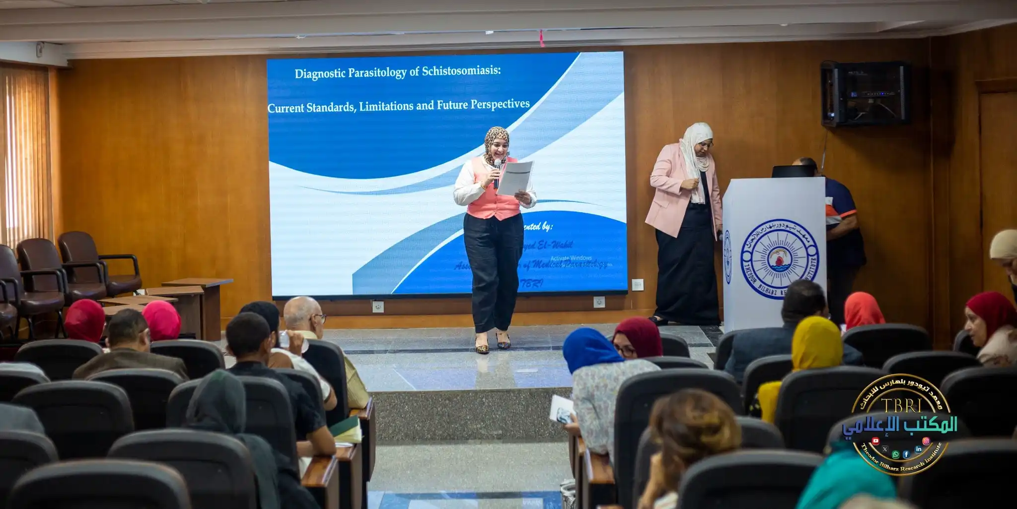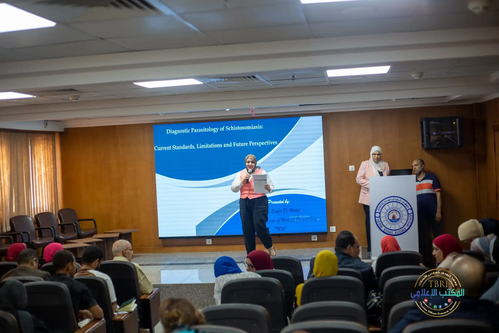 The first day’s sessions addressed the current status of schistosomiasis in Egypt, traditional and modern diagnostic methods, and the role of biotechnology and nanotechnology in advancing diagnosis and treatment tools. Research presentations also covered topics such as snail immunity, the impact of climate change on disease transmission, therapeutic challenges, and future perspectives.